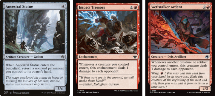 When it comes to winning the game, one handy combo card is Ancestral Statue. With affinity count of 4, you can just keep bouncing this one back to your hand and recasting it, for infinite enters the battlefield triggers. A handy Impact Tremors or Weftstalker Ardent will make short work of your opponents, and you can also use Empty the Warrens as your Storm payoff too.