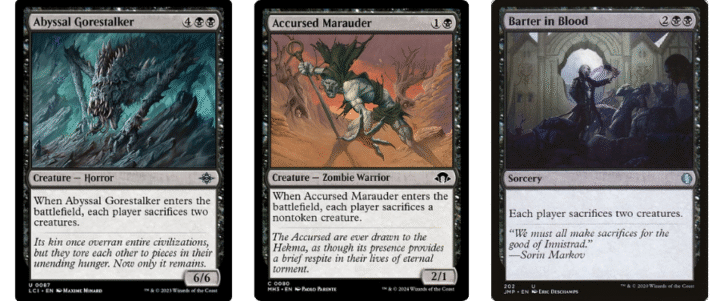 While Super Shredder can just grow organically, that doesn’t mean you can’t optimize your deck to make him grow even more. The easiest way to pull this off in Black is to use symmetrical edict effects. For example, Accursed Marauder, Abyssal Gorestalker, and Barter in Blood are relatively unassuming cards that become completely absurd with Super Shredder in play.