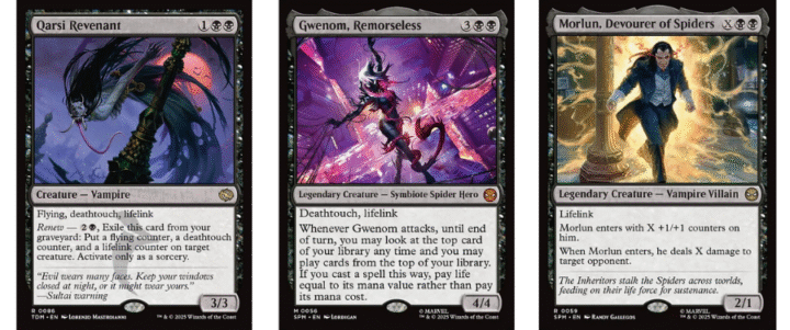 Among the strongest cards that enable this kind of thing are Qarsi Revenant, Gwenom, Remorseless, and Morlun, Devourer of Spiders. The revenant gives you an aerial threat that comes with other keywords that make it even more effective as an attacker and blocker, Gwenom comes with an attack trigger that gets a lot better the bigger she is, and Morlun has the added bonus of immediately gaining you that life back since it does X damage to your opponent when it enters.