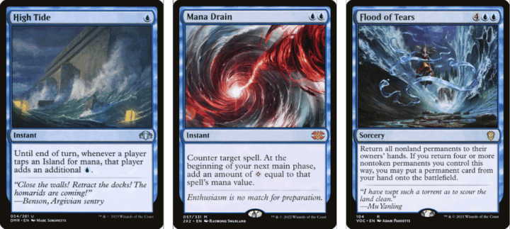 You’ll want to ramp plenty and maybe even pack a High Tide and a Mana Drain in order to get the mana to cast you big spells. Bounce wraths like Flood of Tears can help you to drop that top end into play. Enchantments like Extravagant Replication and Moonlit Meditation help you get even more value off of your high-end.