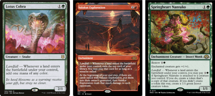 Landfall is obviously a good payoff in a deck like this, so for our early game, we’re producing extra mana with Lotus Cobra, seeing more cards with Valakut Exploration, and making token blockers with Springheart Nantuko.