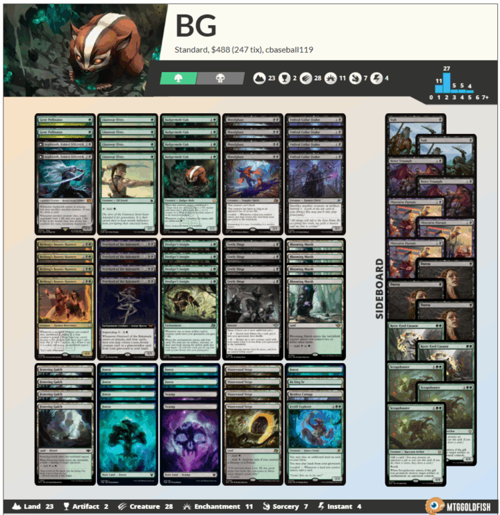 All of the current creature-combo decks are running Badgermole Cubs to help expand their options and accelerate their gameplan this way. But only with the Earthbending Sacrifice deck does the Cub actually factor into its primary win condition. Based in GB, this deck attempts to assemble a combo of Umbral Collar Zealot (or another sac outlet) and Beifong’s Bounty Hunters, plus one or more Bloodghast (which can start in the graveyard).